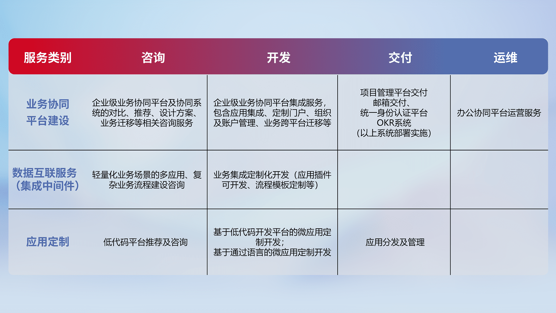针对钉钉、、企微、、IDaas等平台级产品提供产品的规划、、、方案、、、、交付、、、定制化开发等服务,,,,实现如统一协同办公、、、、智能客户服务、、、混合会议管理、、、智能数据查询、、、等业务场景,,实现数字化转型。。。。