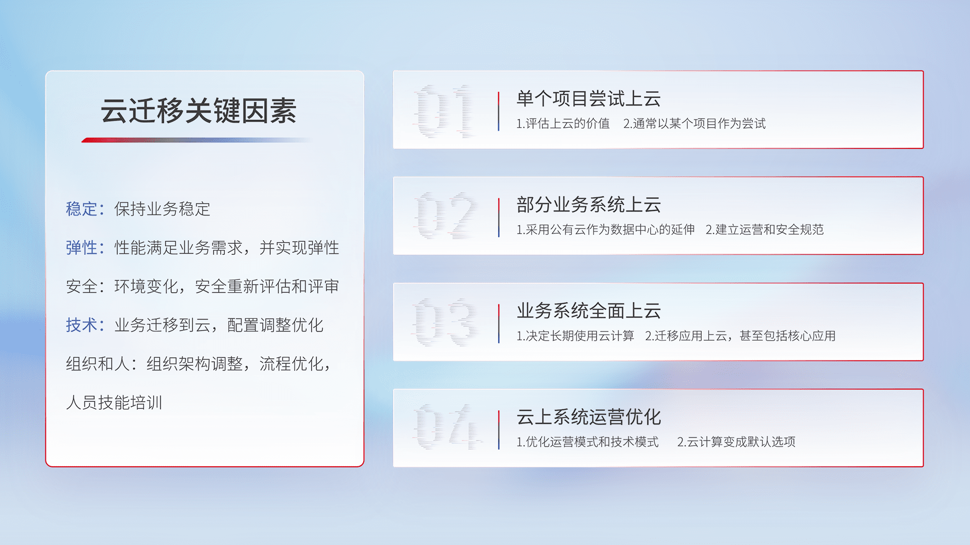 结合实际业务,,,,从规划设计、、、、云平台选型、、、、云原生改造、、数据迁移、、、集成交付,,,,迁移全过程为客户识别最佳上云路径,,,,做好风险识别管理,,设计网络架构、、、身份权限、、安全审计合规、、、操作审计、、日志审计、、、、监控告警策略、、多站点容灾设计等,,对云上基础设施进行整体规划,,,,提升IT治理水平,,以满足弹性、、高可用、、、、高性能的需求。。