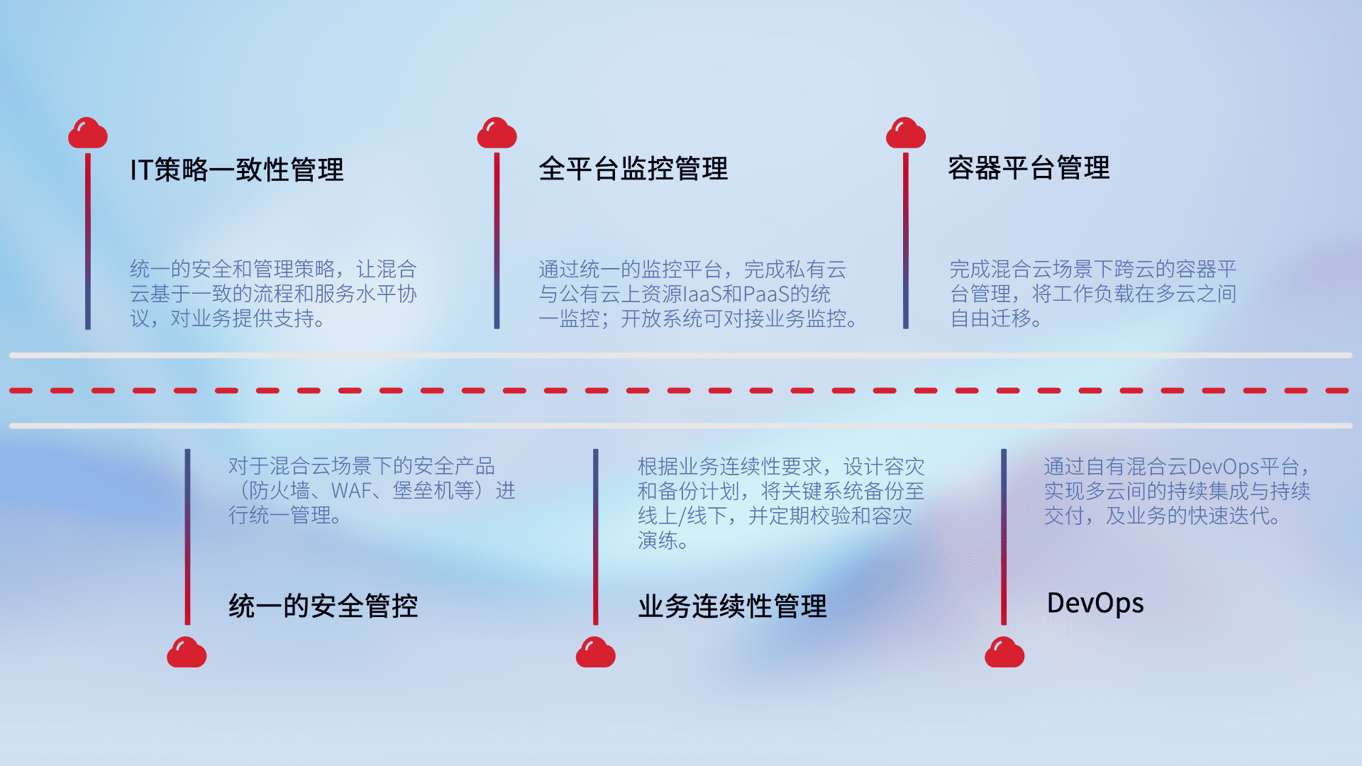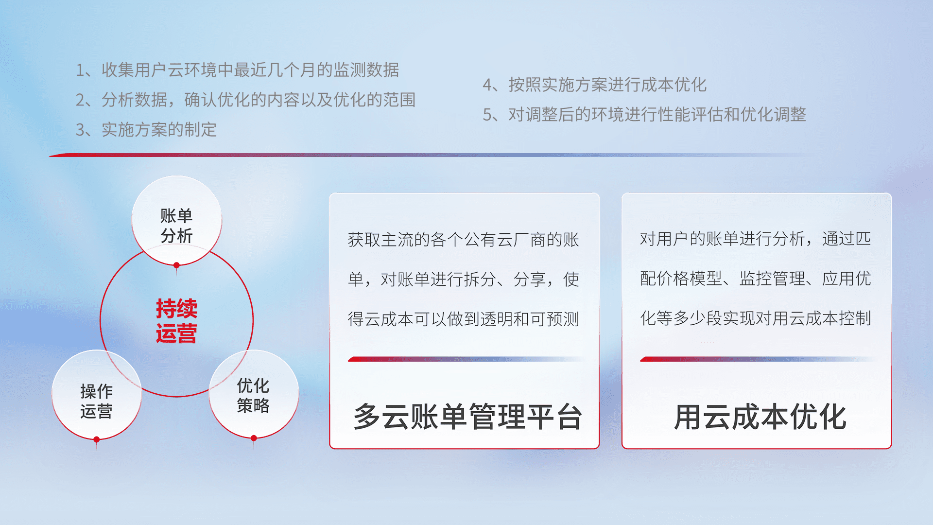 通过多云纳管,,,以统一的资源数据模型把客户的云资源进行抽象和封装,,进而实现对多云资源的统一操作,,,保障云资源管理的可靠性、、稳定性与可用性。。。。量身定制化运维内容,,配置、、开发运维、、、补丁管理、、、备份、、、监控、、、认证和访问管理、、、审计和日常巡检等,,,,保障在用云过程中的可靠度,,稳定度以及高可用率。。。。
