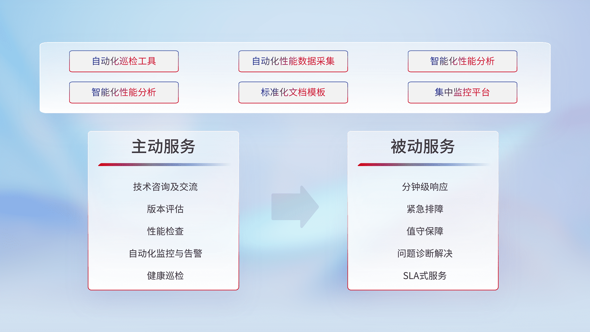 智能化工具和标准化文档,,,,保障服务质量,,,,提供主动服务(包含技术咨询、、、、版本评估、、、、性能检查、、、自动化监控与告警、、、健康巡检)和被动服务包含(分钟级响应、、、、紧急排障、、值守保障、、、、问题诊断解决、、SLA服务)。。。。